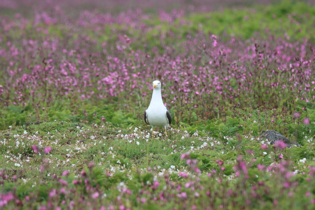 We came across the Harold Stone, which is said to be a man-made structure from the Bronze Age or so. It means Skomer was inhabited long ago. We walked a little ahead and reached a rocky area – the view from there was magnificent. All around us we could see meadows full of red campions and other wildflowers. Gulls were flying around, kicking up a ruckus as they normally do.